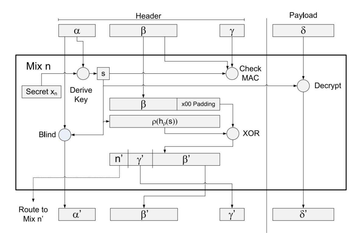 - β (Beta): encrypted routing information (the header that tells each hop where to forward next).