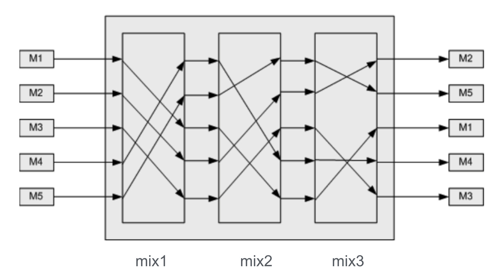 The original design was introduced by David Chaum, the so called “Chaum Mix”. The design idea is simple: A mix relay collects messages from many senders, shuffles them, and forwards them such that an observer cannot reliably link inputs to outputs.