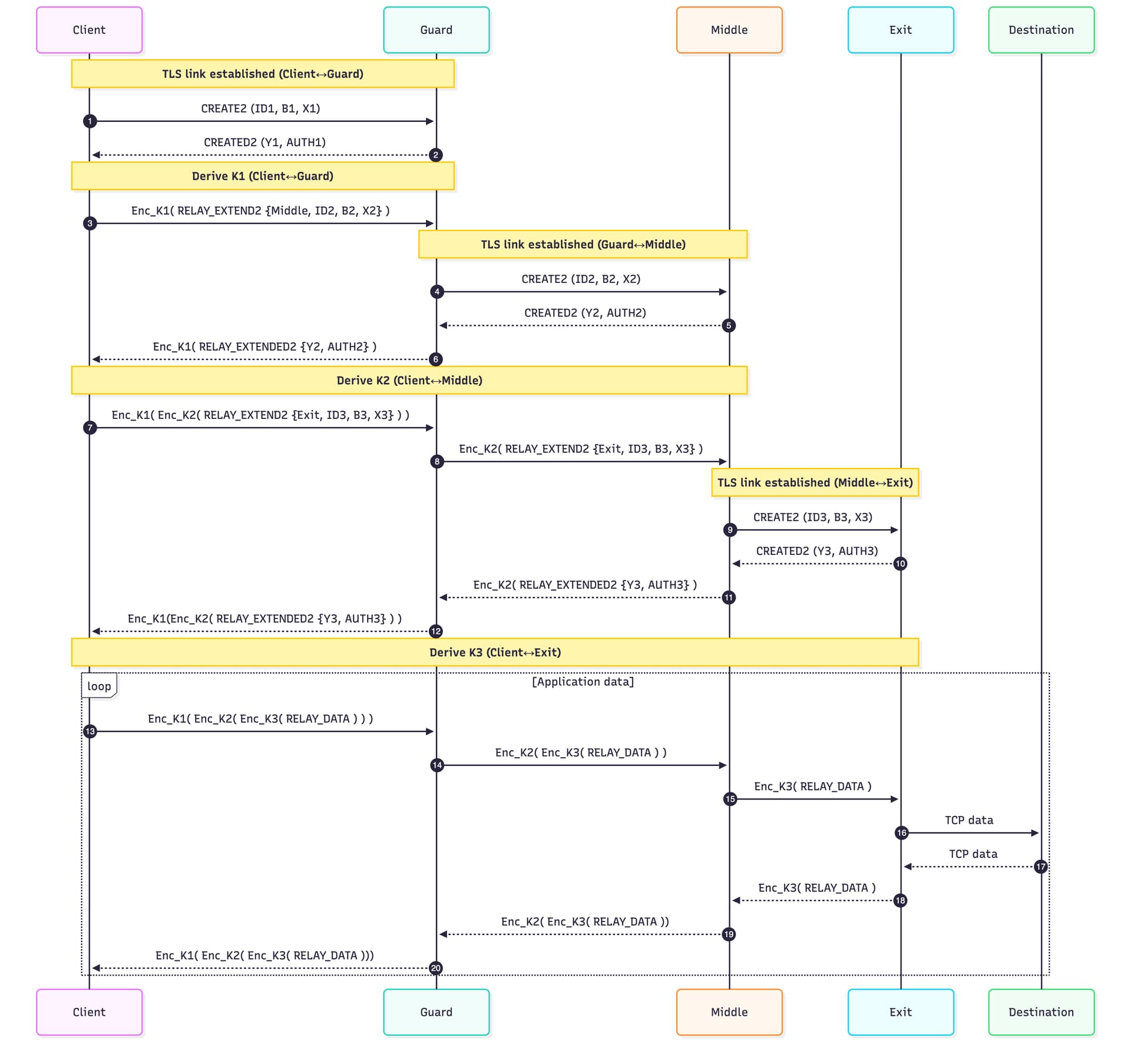 Once the circuit is set up as described above, the traffic is then encrypted in layers with the forward traffic Client --> Dest being: